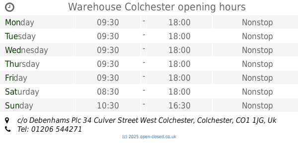 It is also possible to : Edit these OPENING HOURS of Store Warehouse In Colchester, c/o Debenhams Plc 34 Culver Street West Colchester,